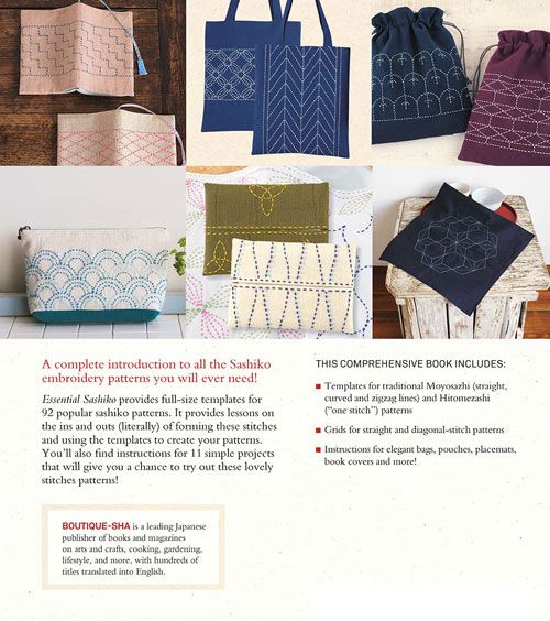 Essential Sashiko provides full-size templates and patterns for 92 beautiful sashiko stitches – all the patterns you are likely to need for any project you wish to undertake. It provides detailed lessons on how to form the stitches and how to use the accompanying templates to create your patterns.