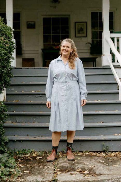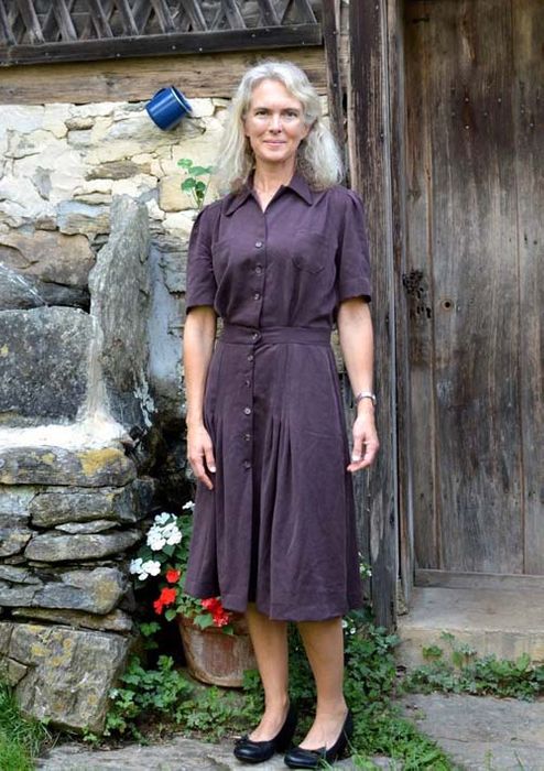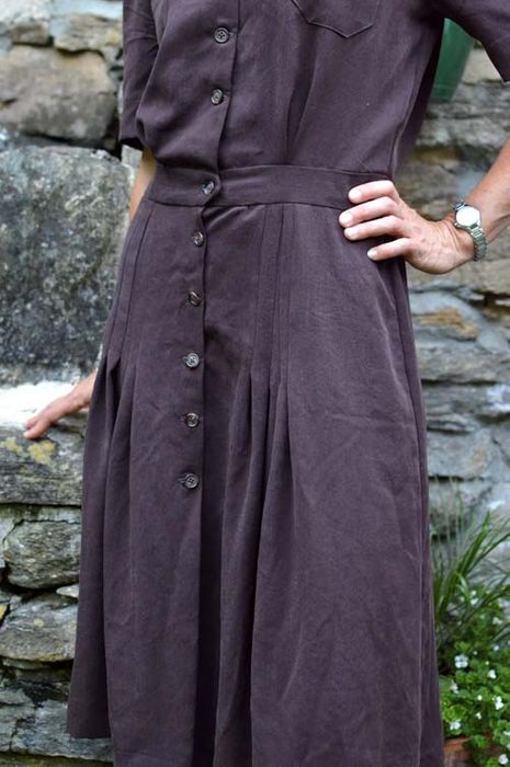 The Sporty Forties' Dress sewing pattern is a shirtwaist, buttoning all the way to just-below-the-knee hem. The bodice softly pleats from the shoulder seams and into the waistband. Both long and short sleeved versions have pleating detail at the shoulder. The skirt sports knife pleats in the front allowing freedom of movement. Two breast pockets complete the dress. Sizes: XS–3XL.