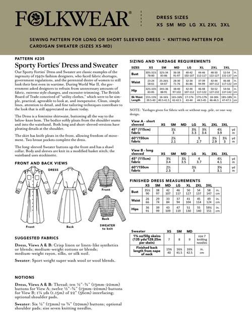 Suggested fabrics: Dress: Crisp linen or linen-like synthetics or blends, medium-weight cottons or blends, medium-weight rayon, silks, and silk noil. Sweater: wool, wool blends (135-150 yards/50g skeins) or equivalent; gauge: 24sts/4" on No. 7 needles.
