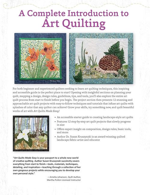 Art Quilts Made Easy is an approachable project guide that will walk you through everything you need to know to be successful in the craft of art quilting. Opening with sections on how to plan and map out your quilt, design rules and guidelines, basic tools and the entire art quilting process from start to finish, you'll feel ready to get started.