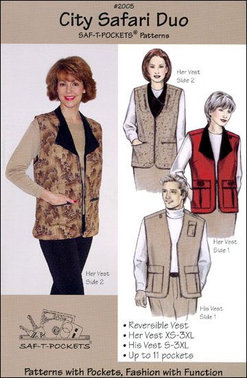 This design offers the benefits of pockets to both men and women. One side of this reversible vest features two patch pockets with two hand pockets hidden beneath plus a zippered patch pocket on the back. The reverse side has two chest pockets, two hand pockets and a back pocket all with zips. Options include a phone pocket, epaulet to hold your camera on your shoulder and a loop for hanging your glasses. The collar is optional and can be worn up or down. Multi-sized: XS – 3XL