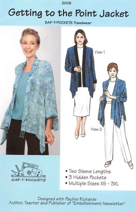 The unusual cut of the jacket falls into soft bias points in front and is squared-off in back. The set-in sleeves come in 3/4 or full length. The jacket is accented with a front band and cuffs that can be made of matching or contrasting fabrics. Hidden inside the jacket is a hanging pocket attached to the armhole and the two pockets inside the front band are perfect for a credit card, money or a lipstick. This comfortable jacket is perfect for a black tie event or everyday wear. Multi-sized: XS – XXL