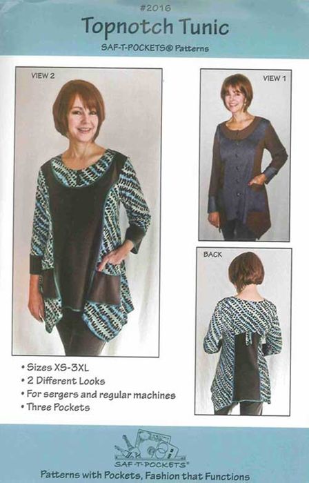All sizes (XS-3XL) included in pattern. The Topnotch Tunic is flattering and offers comfort plus the benefit of pockets. Wear it with slim pants or a skirt for a great outfit. The multi-size pattern and princess lines make fitting your tunic easy. View 1 buttons up the front and has full length sleeves with a contrast band at the wrist. Wear it open and over a t-shirt as a cute jacket. View 2 has 3/4 length sleeves with contrast bands and three buttons at the front neck. Both views slip on over the head for easy wearing and the backs are accented with a button tab. There are two handy pockets plus an optional hidden pocket that hangs inside from the underarm seam. Instructions on how to do serger trim and lots of other fun ideas are included.Fabric Choices: Knits such as Ponte double knit, rayon, poly, cotton/spandex, slinky.