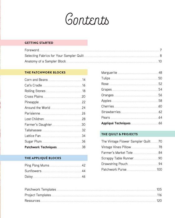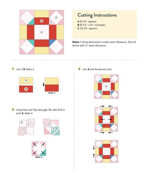 The book features step-by-step instructions for assembling each block with lots of detailed, close-up photos. The book also includes five adorable companion projects, such as pillows, tote bags, table runners and more, all utilizing the sampler block designs.