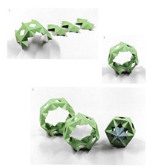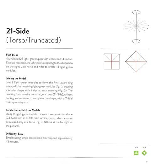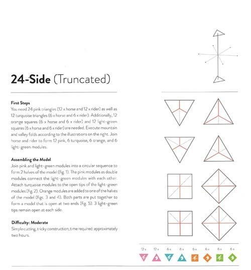 Alexander Heinz introduces eight paper-folding models most of which are easy to assemble. Using a combination of folded triangles, squares, pentagons and hexagons, they are assembled in a symmetrical modular way, allowing you to create more than 60 forms by using and combining the different folded-paper models.