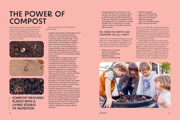 The book is pitched at the home composter, including people who live in apartments and houses with or without gardens (yes, you can compost without a garden!). Kate helps the reader to rethink their waste management and teaches them how easy it is to divert food scraps and household carbon away from landfill. She unravels the technicalities of soil science, talks through the building blocks of a robust compost system and busts a few myths along the way. Charming illustrations, how-to photos and Kate's warm, entertaining voice complete the package.