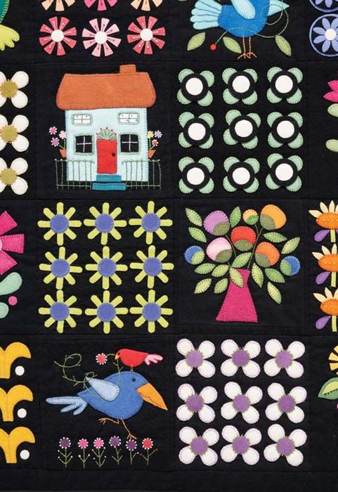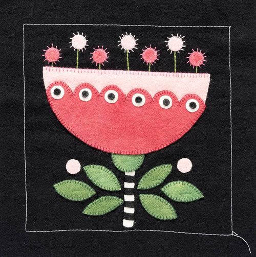 A black background and simple embroidery embellishment highlight beautiful jewel-toned colours. Erica shows you how easy it is to get lost in wool appliqué; the craft is incredibly portable and perfect for a wool appliqué class or personal challenge!