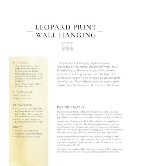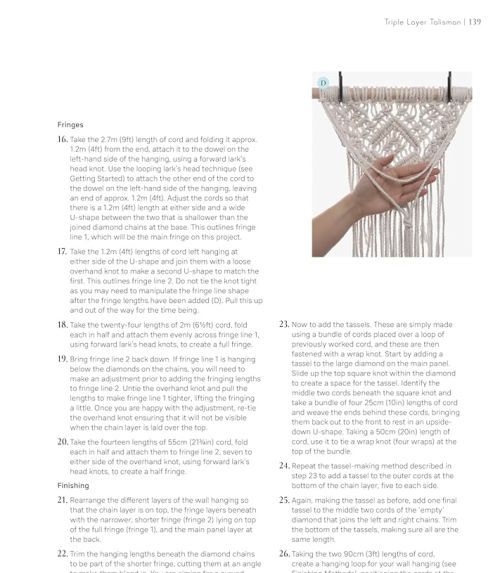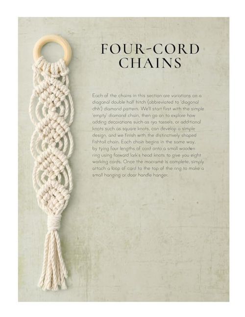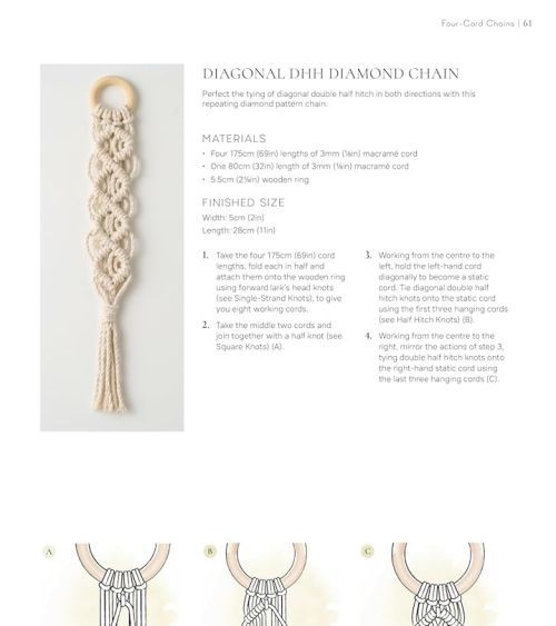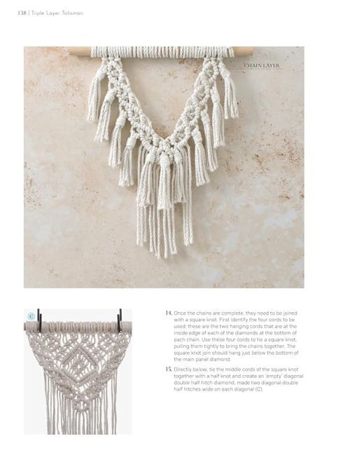 This macramé pattern sourcebook includes all the classic macramé knots and patterns as well as more contemporary designs such as leaves, wings, flowers and other motifs. In addition to the knot and pattern instructions there are step-by-steps for 17 projects including large wall hangings and plant holders.