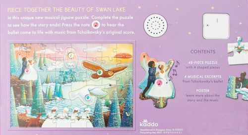 Piece together the magical adventure of Tchaikovsky's Swan Lake ballet with this unique musical jigsaw puzzle. The sturdy gift box contains the 48-piece puzzle (44 regular pieces, plus 4 shaped pieces with cutouts that give access to the musical buttons on the included frame) and an educational poster. The finished puzzle measures 29.7 x 21 cm.