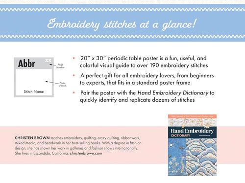 This is a perfect gift for all embroidery lovers, from beginners to experts, that fits in a standard poster frame. Pair the poster with the Hand Embroidery Dictionary to quickly identify and replicate dozens of stitches.