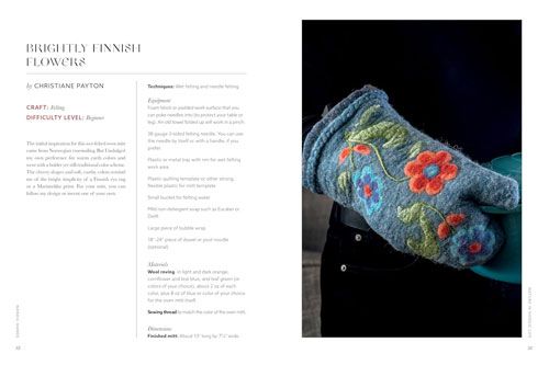 Vivid photos and spirited text explain the values and beliefs core to Scandinavian life, nature, community, craftsmanship and sustainability. There are 4 to 7 thoughtfully designed fibre art projects featuring knitting, felting and weaving that reflect each value or custom. Each project's difficulty level is marked (beginner, advanced beginner, and intermediate).