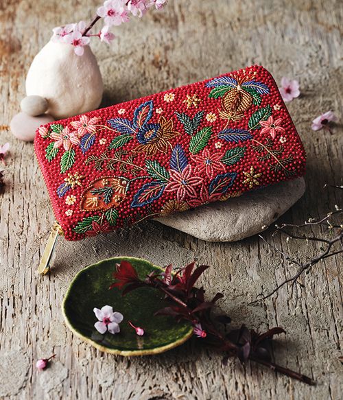 - Tropicana Vibrant red zipped purse with flowers and leaves inspired by tropical plant forms
