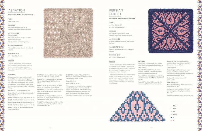 The tiles are constructed using a number of different knitting techniques including working in rows, modular knitting and centre out knitting so there are lots of different methods to try. All the knitting stitches and techniques you will need to make the motifs are included in the techniques section along with helpful step-by-step artworks and instructions.