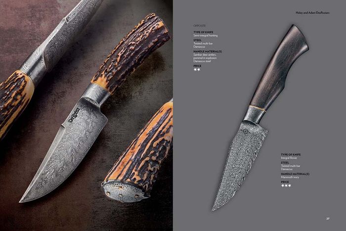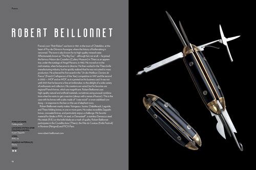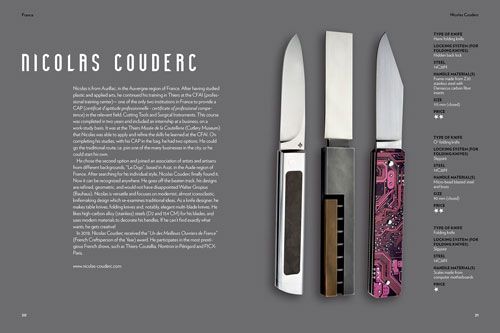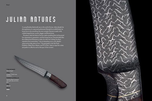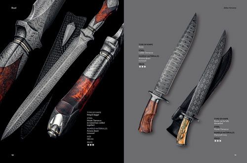 Eash of the 46 artisans selected for this book has their own style and character, mixed with utility and the knifemaking tradition of their home country and culture. Some are quite startling in their inventiveness: a simple steel knife with a handle made from a fox's lower jaw (Mickaël Moing, France); Damascus steel blade and a fossilized mammoth ivory handle (Pekka Tuominen, Finland); stainless steel blade with an ironwood handle encrusted with mother of pearl and precious stones (Harumi Hirayama, Japan); and a "button lock" knife of Damascus steel, with a handle of Damascus, gold, titanium and mother of pearl (Michael Walker, USA).