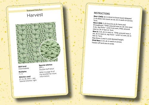 The cards measure 140 x 85mm and are enclosed in a sturdy box. There are 50 cards, each with a stitch pattern, and 2 further cards which contain a guide to using the cards plus stitch and hook conversion tables. In addition, you’ll find a 16-page booklet providing all the essential knowledge you need to use your cards, plus simple instructions on the basic and special stitches that make up the stitch patterns.