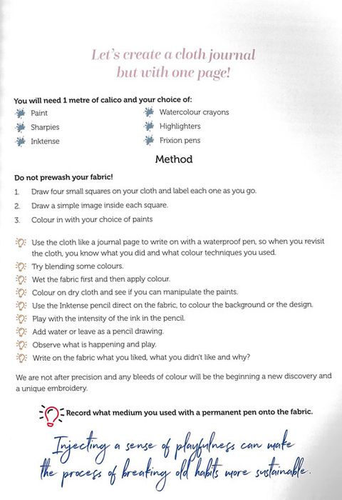 Explore the process of play using colour and embroidery. Embroiderers and fibre artists often want to break free and find their own style and story on cloth. A perfect add on to the first book Improv Embroidery, you will learn more about the process and create a cloth that echoes your voice. Every page is filled with prompts, ideas and images to help you on your journey.
