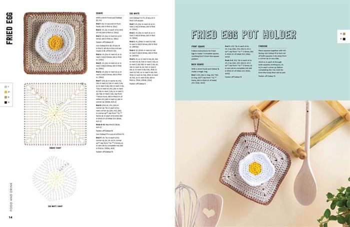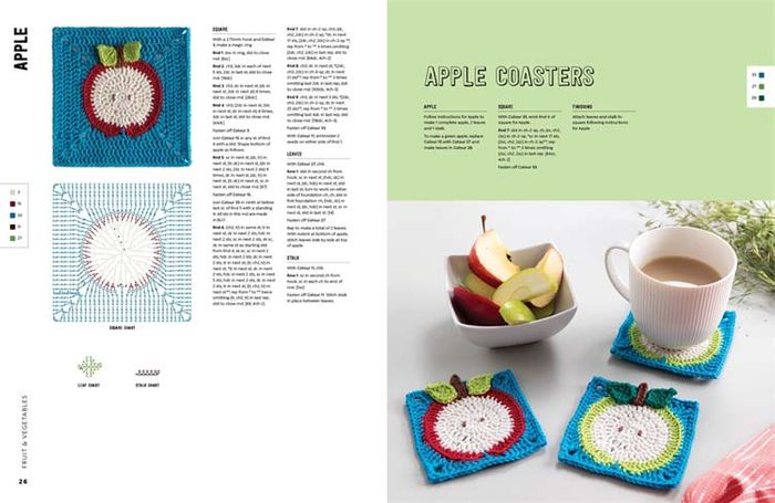 As well as the granny square patterns there are also six bright and beautiful projects including a fun pineapple cushion, a cute fried egg potholder, quick and easy apple coasters, a strawberry themed towel topper, a teapot pincushion and a cherry envelope pouch. Each granny square has the full written pattern plus large sized charts and all the stitches and techniques required are featured in the general techniques section.
