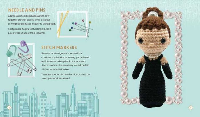 The instruction book includes everything you need to know to make your own amigurumi Audrey doll. This mini Audrey is styled in one of her signature outfits: the black sheath dress with gloves, pearls, and tiara she wore in the 1961 film Breakfast at Tiffany’s. The book explains all the crochet techniques used in the project so even fans who are new to crochet can enjoy it. The pattern contains step-by-step instructions and helpful how-to photos.