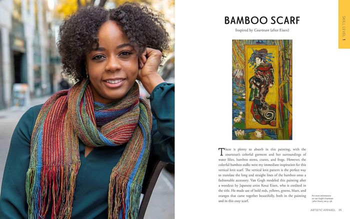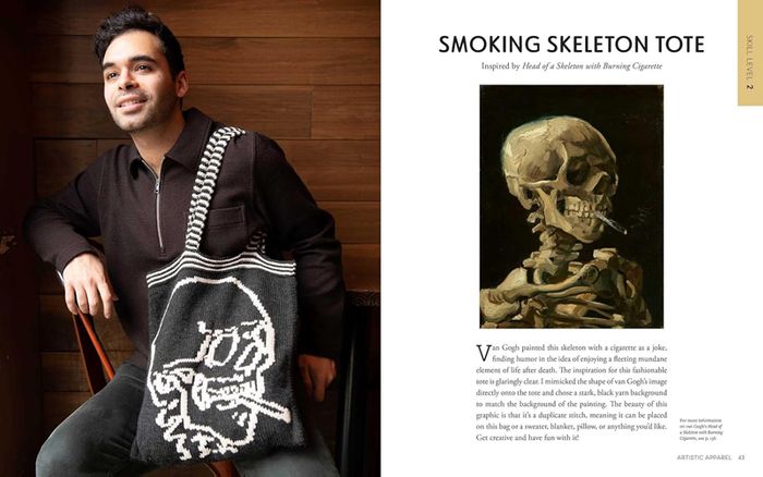 The book features a wide variety of patterns for knitters of every skill level, from a vase cozy inspired by van Gogh’s Sunflowers and a cap inspired by his famous An Old Woman from Arles, to a lacey shawl invoking his Almond Blossom, a scarf inspired by his swirling nighttime backgrounds and a tote emblazoned with his famous Head of a Skeleton with a Burning Cigarette.