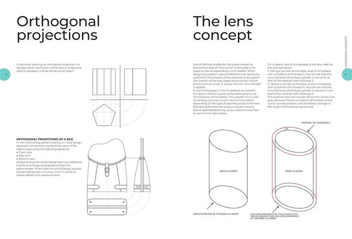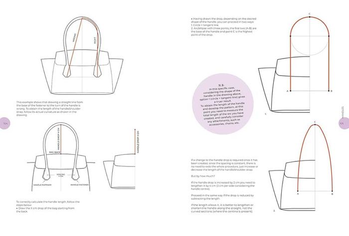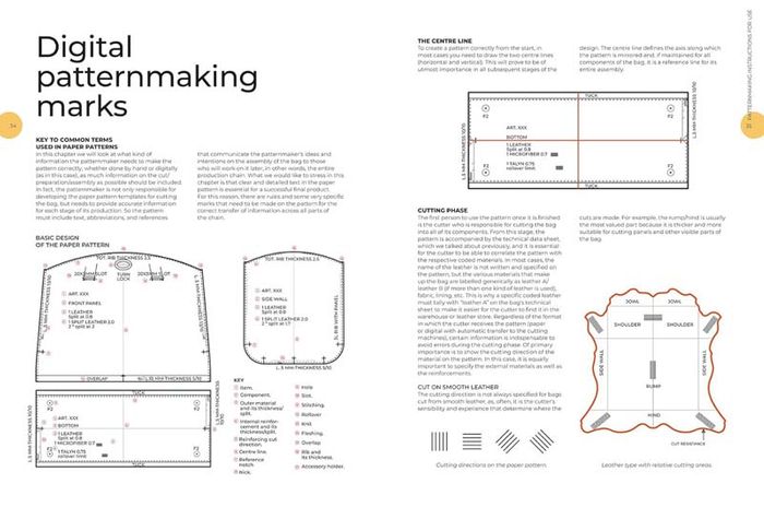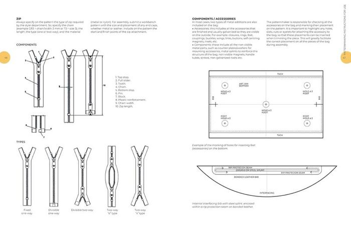 Divided into two parts, the manual explores first the working process of bag patternmakers and their skills. It then explains the anatomy of bags and characteristics of the most popular models, introduces into the reading of style cards and technical drawings, to the signs to be included both in a paper as in a digital pattern to compile all information necessary to make a bag. This will help readers with the second part, as the book guides them through the main construction techniques for each type of bag, explaining sides, handles, flaps, linings and bottoms in meticulous detail giving tips for a correct realization.