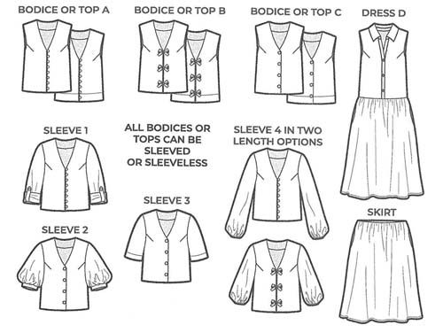 The Porter pattern features a dress with low-waisted gathered skirt and a waist-length top option. Customize your look with four bodice and sleeve options, a "V" neck or collar, and various front openings.