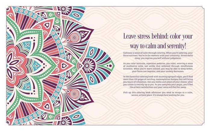 In our hectic world, colouring is a relaxing activity everyone can enjoy. Calm & Serene Coloring Book is a creative way to unwind, with no pressure, just fun. You’ll find over 150 designs to choose from, including: