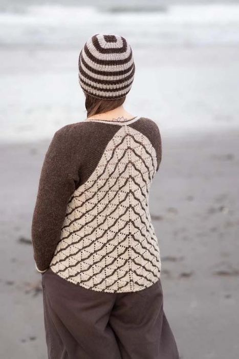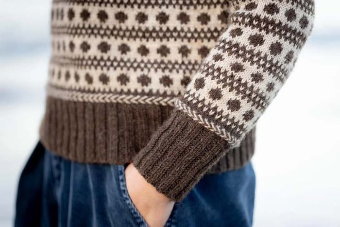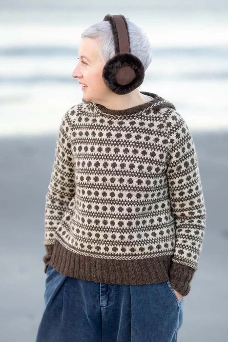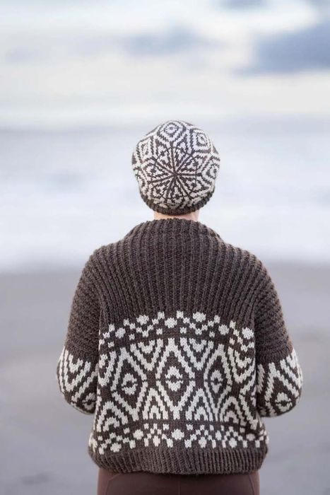 A trick of the light that’s only ever seen in winter is echoed in the structural motifs of Sun Pillars, while the spectacle of planetary alignment inspired allover colourwork hoody, Clanjamfrie. Kate has an abiding love of bold, rhythmic, two-tone patterns, which she explores through classic silhouettes like the Blue Monk gansey and Lilias Day yoke pullover, alongside contemporary shapes like oversized, drop-sleeved Ciar.