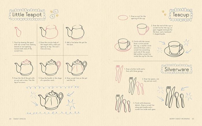 Each chapter includes signature art pieces and the following pages break down important objects to draw. In a craft room, learn how to draw an easel, a canvas, letters and envelopes, and scissors, but the possibilities are endless in how you fill your own room with Sweet Spaces-inspired things! The book includes a guide of repeated items and symbols featured in the interiors, such as flowers and strawberries, as well as a simple perspective guide to draw a room.