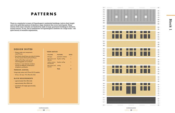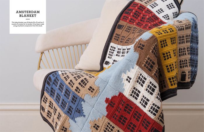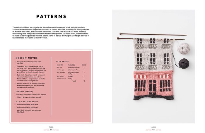 The buildings are knitted as separate blocks but they can be joined together to make blankets, throws and cushion covers as well as other accessories and homewares. There are guidelines for yarn amounts and the number of blocks needed to make three different sized projects for each city: a large blanket; and baby blanket and a cushion cover but you can use your knitted building blocks however you like – the world is your oyster!