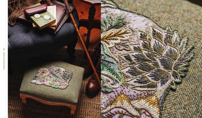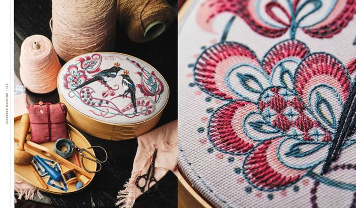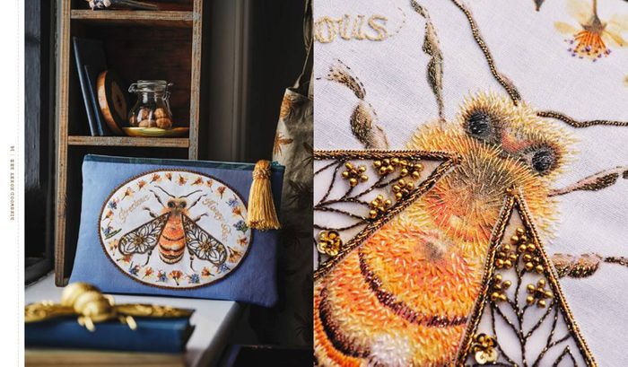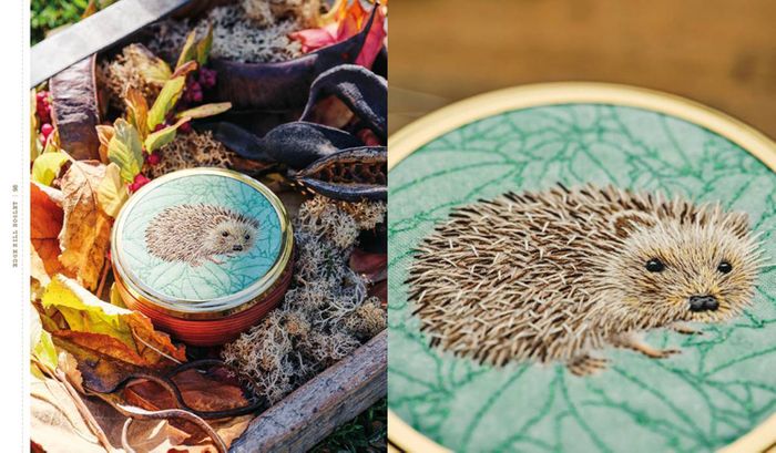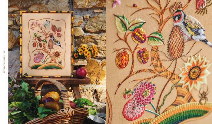 Nicola Jarvis presents eight brand-new projects celebrating local wildlife and their habitats, each one reflecting her trademark design style with flowing lines and intricate patterns, masterfully stitched onto printed panels. From a dormouse sleeping in its nest made from local flora, magpies frolicking amongst ornamental leaves, a moth and a snail taking respite in ivy through to a bountiful orchard visited by a majestic goldfinch.