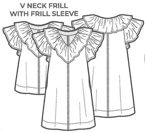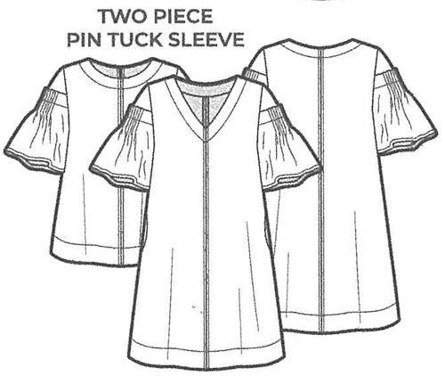 The Zalia Extension sewing pattern features a v-neck frill option and sleeve choices include full length or short gathered sleeves, two-piece lantern sleeves, pintuck sleeves, or frill sleeves. An optional underarm gusset provides extra coverage.