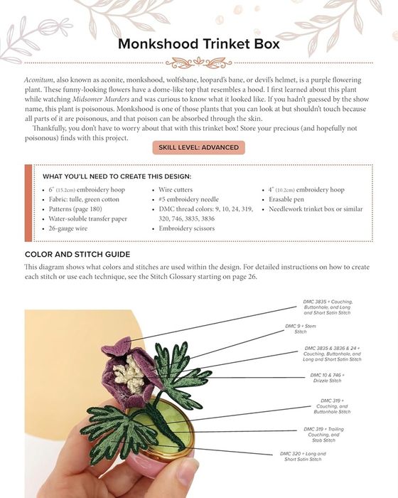 The easy-to-use instructions will help you improve your stumpwork, mastering mini-skills like padding and needle weaving. Learn how to use the best fabrics and how they pair with critical needle techniques including embroidery, darning and beading. Whether you’re a beginning embroiderer or an advanced needlework practitioner, there’s something inside this book for you to learn how to creatively bring all sorts of botanical wonders to life.