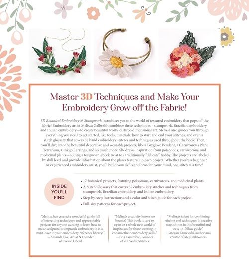 Raise your embroidery game, and your stitchwork, with this guide to 3D embroidery and stumpwork. Featuring 17 stumpwork, or raised embroidery, projects for embroiderers of any skill level, Melissa Galbraith offers a user-friendly introduction for anyone who wants their embroidery to pop.
