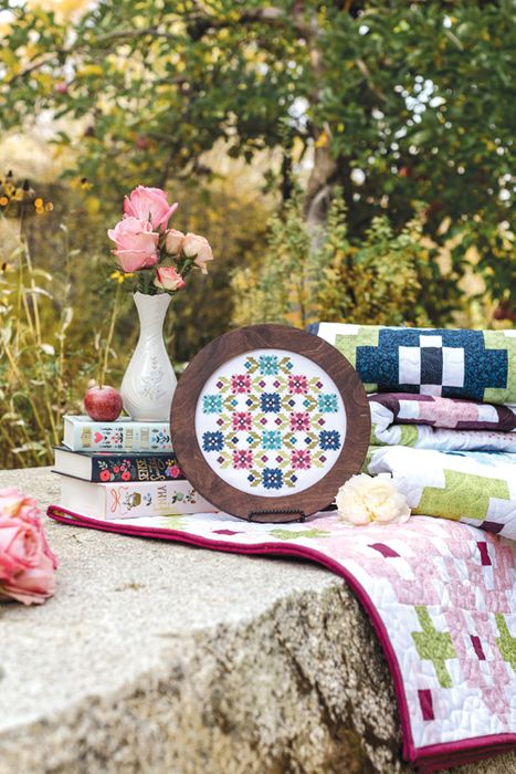 Shelley Cavanna returns with a breathtaking new sampler and collection of quilts – but that’s not all! Each quilt and block, inspired by cross-stitch florals and motifs, is accompanied by a matching cross-stitch project.