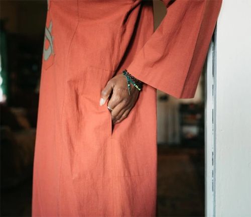 This is a shortened version of the traditional Egyptian galabia or robe. Loose-fitting style with side panels and slit pockets. The yoke can be turned to the inside, or to the outside for interesting contrast.