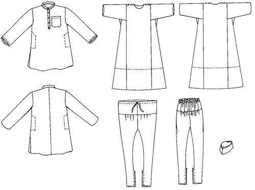 Suggested fabrics: For the Kurta, choose any shirting fabric from gauze to flannel. For the Kamiz and Churidar, choose light to medium-weight cottons, silks or synthetics; lightweight wool. For the hat, choose medium-weight cotton, silk or wool; decorative weaves or brocade.