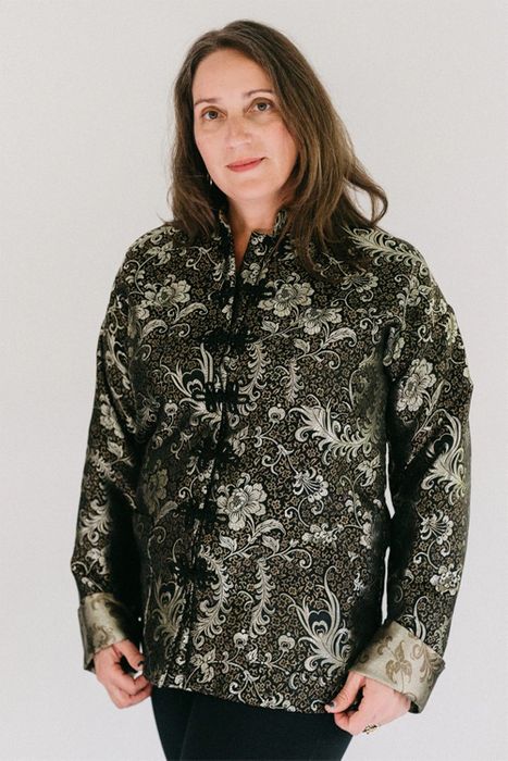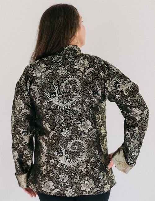 Suggested Fabrics: Soft and fluid silks, synthetics, cottons, silk velvet. For a more structured look, cotton, lightweight denim or corduroy, medium-weight silk, lightweight wool. NOTE: Jacket lining shows when cuff is rolled back.