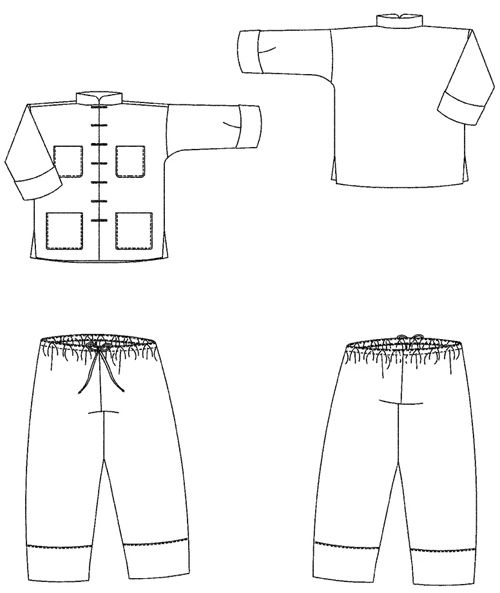 The loose-fitting Pants have a drawstring waist and cuff bands that can be made of the same fabric or a complementary decorative fabric.