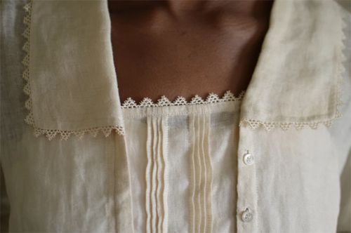 The back of the blouse extends over the shoulders to meet the lightly gathered front, and gathers at the center back waist into a self-fabric tie or ribbon, which encircles the waist to tie in front. The long collar falls softly over a center panel, or vestee, forming a deep rectangular neckline. Tiny buttons close the blouse on the left side. Long set-in sleeves gather into wide turned- back cuffs. The centre front panel can be lacy, pintucked, or plain; the collar and cuffs can be embellished in many ways. Pattern includes instructions for drawn-thread work.