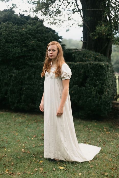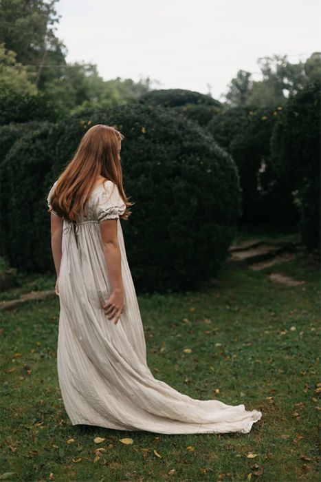 This high-waisted dress known today as "empire" was worn in the period following the French Revolution in the late 1700s. The revealing style, requiring few undergarments, reflected a desire to return to simpler, classical Grecian dress after the excesses of the European nobility. Narrow bodice is gathered into a skirt that is slim in front and full in back. The optional full-length train and sleeve details make it perfect for a bridal fashion.
