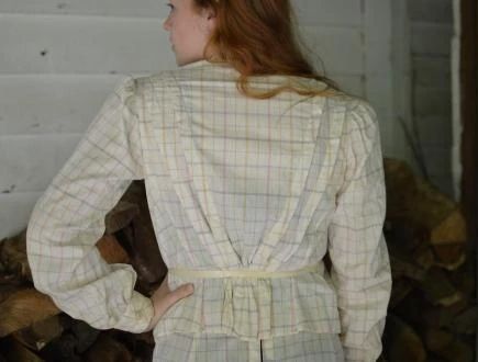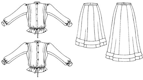 Based on the vintage uniform of the 19th century schoolmarm, this two-piece outfit features a classic "shirtwaist" or blouse with beautifully different scalloped front opening and flattering princess lines. Wear it with the sweeping seven-gore skirt with optional bias trim.