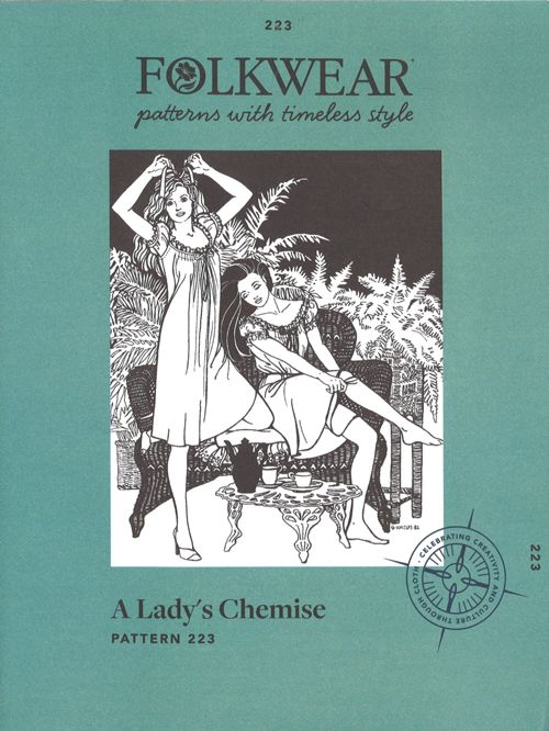 Our flattering chemise was worn during the mid to late 1800s and we offer two appealing versions. Both views have short gathered and ruffled cap sleeves and can be cut low knee-length or at the hip to be worn as a blouse. Delicate pleats accent the centre front and back of the neckline, which is adjustable with feminine ribbon drawstrings. Instructions and alphabet designs for a Victorian monogram are included.