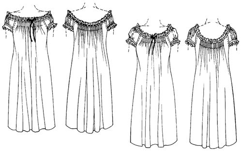 Suggested fabrics: Light-weight cottons and blends such as batiste, lawn, voile, gauze or eyelet; handkerchief linen; silks such as crepe de chine; rayon challis. Originals were made of lightweight muslin or linen.