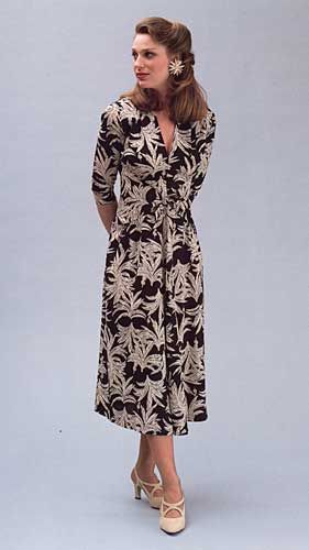 Glamour oozed in Hollywood in the 1930s and 1940s, and this is the daytime dress the starlets wore. It emphasizes curves, drapes elegantly and lends an air of discreet sexiness. The close-fitting bodice is visually cinched in with front waistline ties, and fits smoothly into a flared skirt. Shoulder pads lend that commanding air to any aspiring celebrity.Suggested fabrics: Light to medium-weight fabrics with drape, such as silk or rayon crepe, satin, challis, soft cotton.