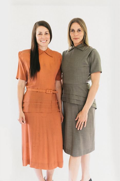 Both dresses have a flattering dropped waistline in back, slightly flared skirt, back zipper and unpressed tucks in front that eliminate the need for bust darts and create the fashionable broad-shouldered look of the late-1930s period.