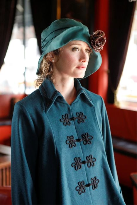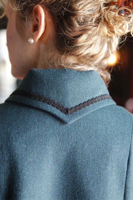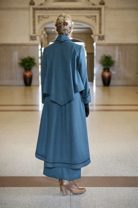 The 1914 Metropolitan Suit reflects the military styling of World War I uniforms, as well as the mid-1910s interest in comfortable and practical two-piece garments. The Jacket features a tall rollover collar with either a curved or pointed centre back, gently pointed centre back hem, softly flared silhouette and turn-back cuffs. The front closes with ornamental frogs. Soutache or other ornamental braid in military design motifs create an accurate period look, but contemporary designs in ribbon or braid trim are attractive too.