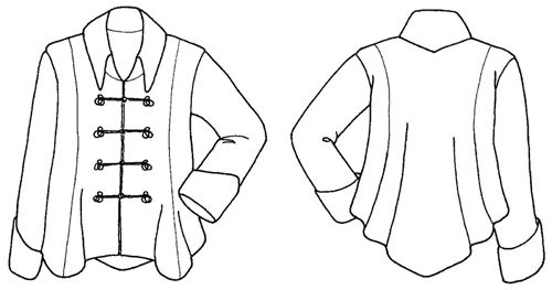The Skirt is slightly hobbled, with a raised waistline and a slit at center back for ease of walking. The Overskirt attaches to the skirt at the top edge and drapes attractively at the back hem. The front folds of the Overskirt can be decoratively topstitched to the Skirt from the waist edge down to the hip area, if desired. If worn without the Jacket, the Skirt can be further embellished with buttons down the front folds of the Overskirt, or with suspenders crossed in the back, or with belt loops and belt at the natural waistline.