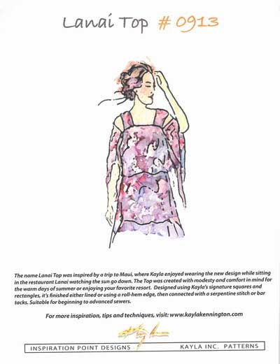 The name Lanai Top was inspired by a trip to Maui, where Kayla Kennington enjoyed wearing the new design while sitting in the restaurant Lanai watching the sun go down. The Top was created with modesty and comfort in mind for the warm days of summer or enjoying your favorite resort. Designed using Kayla's signature squares and rectangles, it is finished either lined or using a roll-hem edge, then connected with a serpentine stitch or bar-tacks. Suitable for beginning sewers.