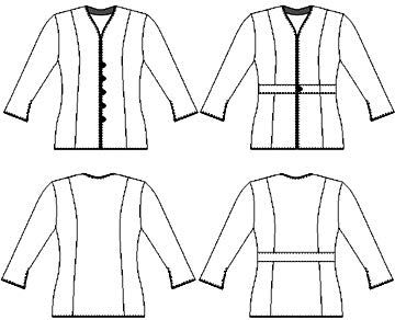 This jacket is princess seamed, hip length and semi-fitted. It is sized for A through to D cup. The sleeves are slightly flared and have a side vent opening. It can be made lined or unlined with single or multiple button centre front closure.