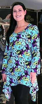 Uniquely styled loose-fitting pullover top. Bias bound scoop neckline, slightly flared long sleeves and extensions that fall from the high hip.